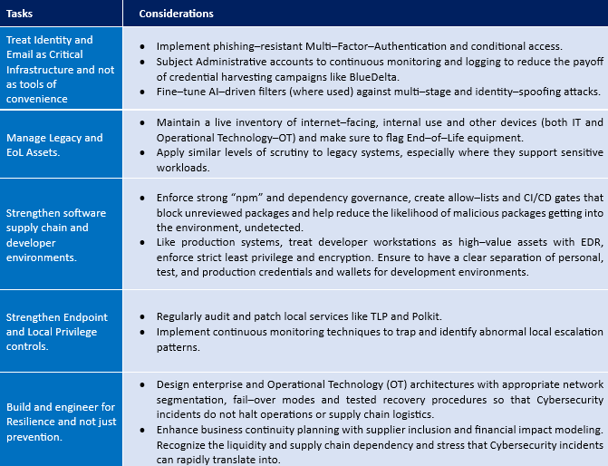 Addressing the inter-connected risks such as the ones highlighted here requires Institutions to shift from reactive engagements to proactive systemic risk management anchored in proven practices of identity management, solution and security architecture, and software supply chain discipline. Given below are a few tasks that Institutions should consider to strengthen their Cybersecurity defences.